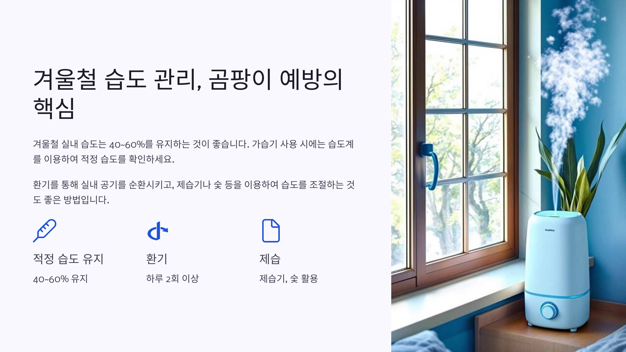 실내 습도가 40~50%를 유지하도록 신경 써야 해요. 가습기를 사용할 때는 습도를 과도하게 높이지 않도록 주의하고, 습기가 많으면 제습기를 활용하는 것도 좋아요.