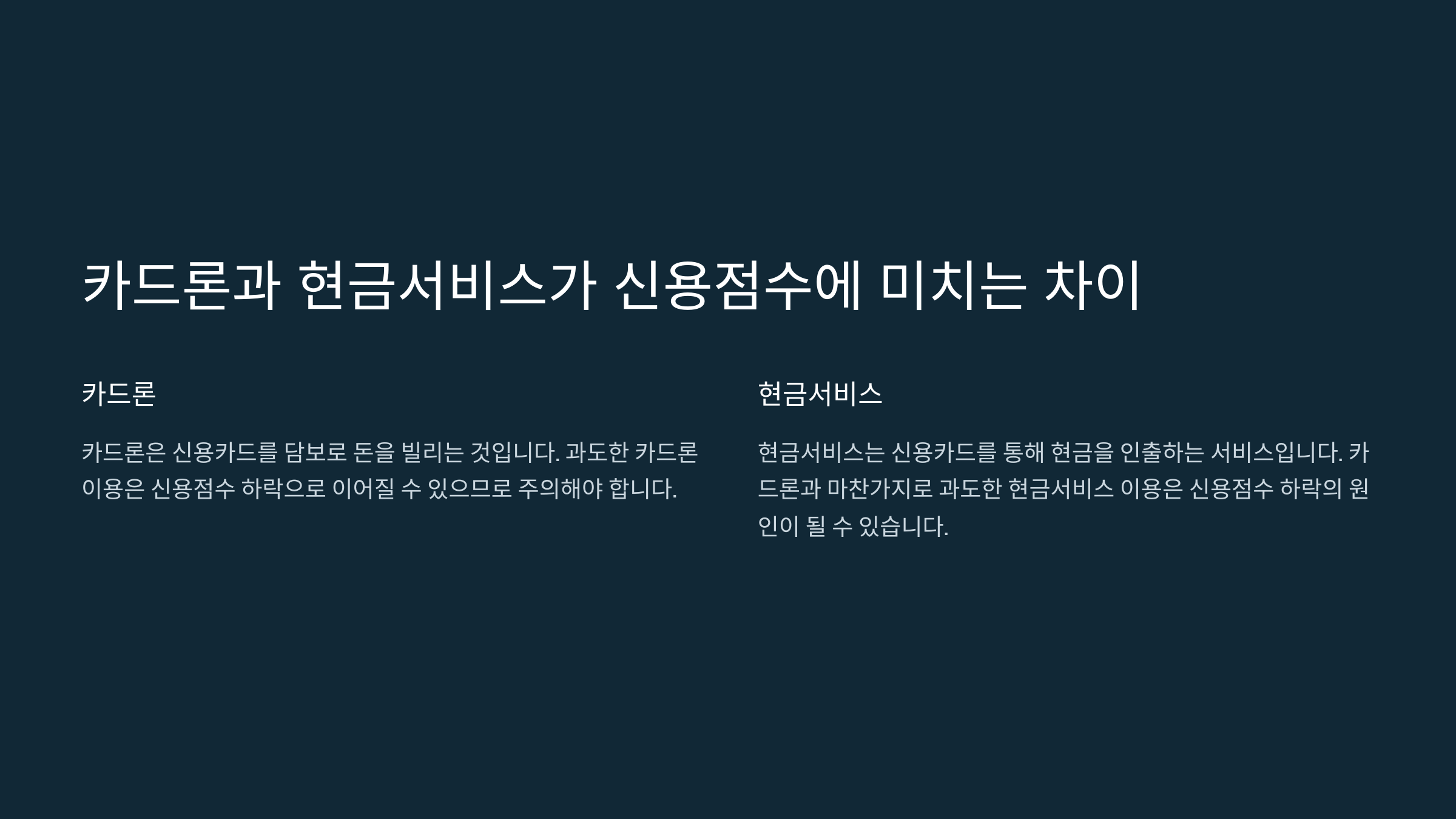 | 신용점수 영향 | 일정 금액 이하·장기 상환 시 비교적 영향 적음 | 자주 이용 시 신용점수 큰 폭 하락 |