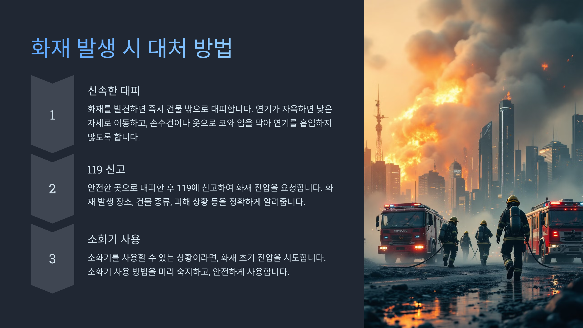 | 3. 119 신고 | 불이 커지면 즉시 신고 (주소, 상황 설명) |