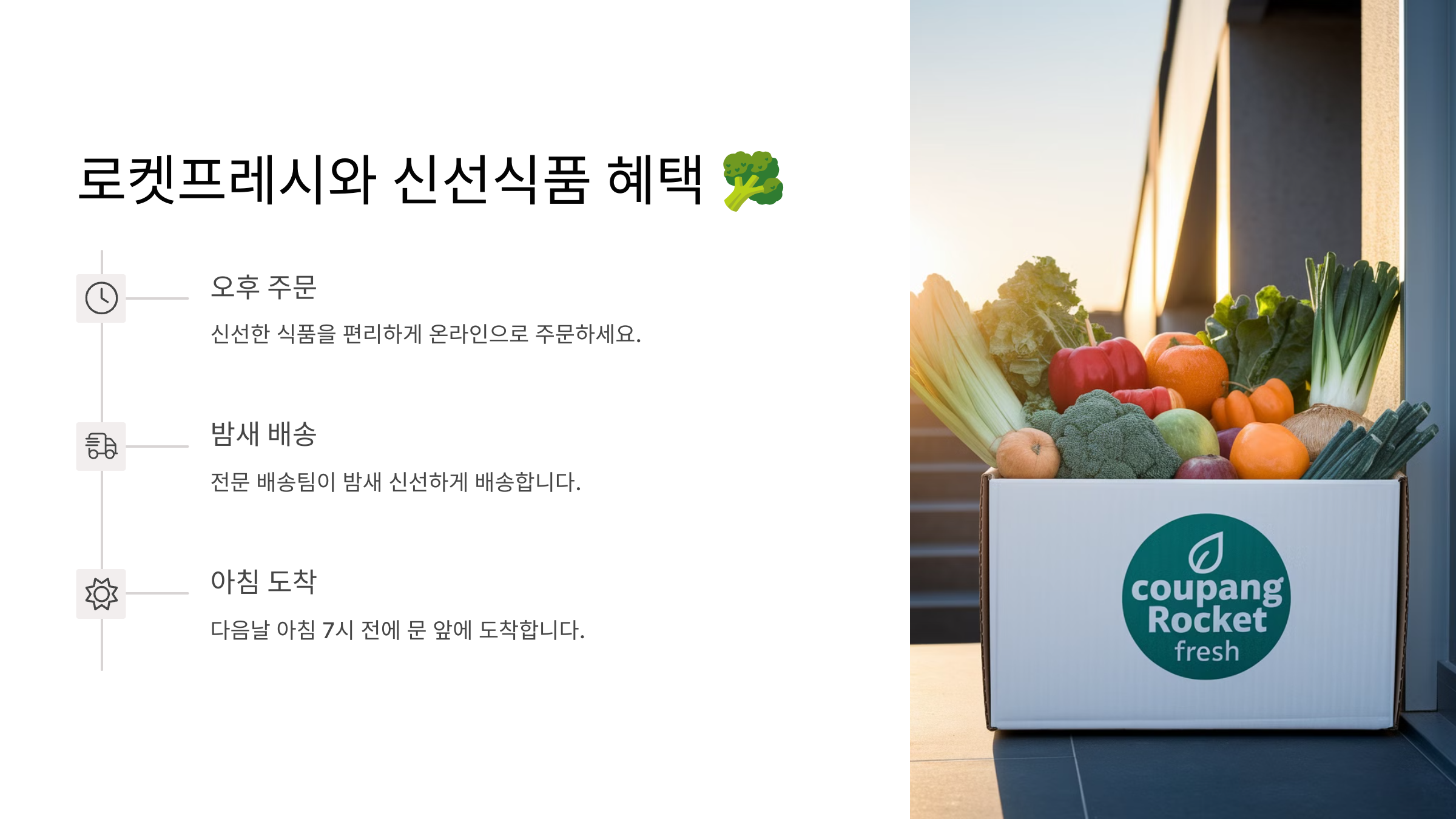 쿠팡의 신선식품 보관 시스템 덕분에 로켓프레시는 언제나 신선한 상태로 배송돼요! 마트에 갈 시간이 없을 때 정말 유용한 서비스죠. 😊