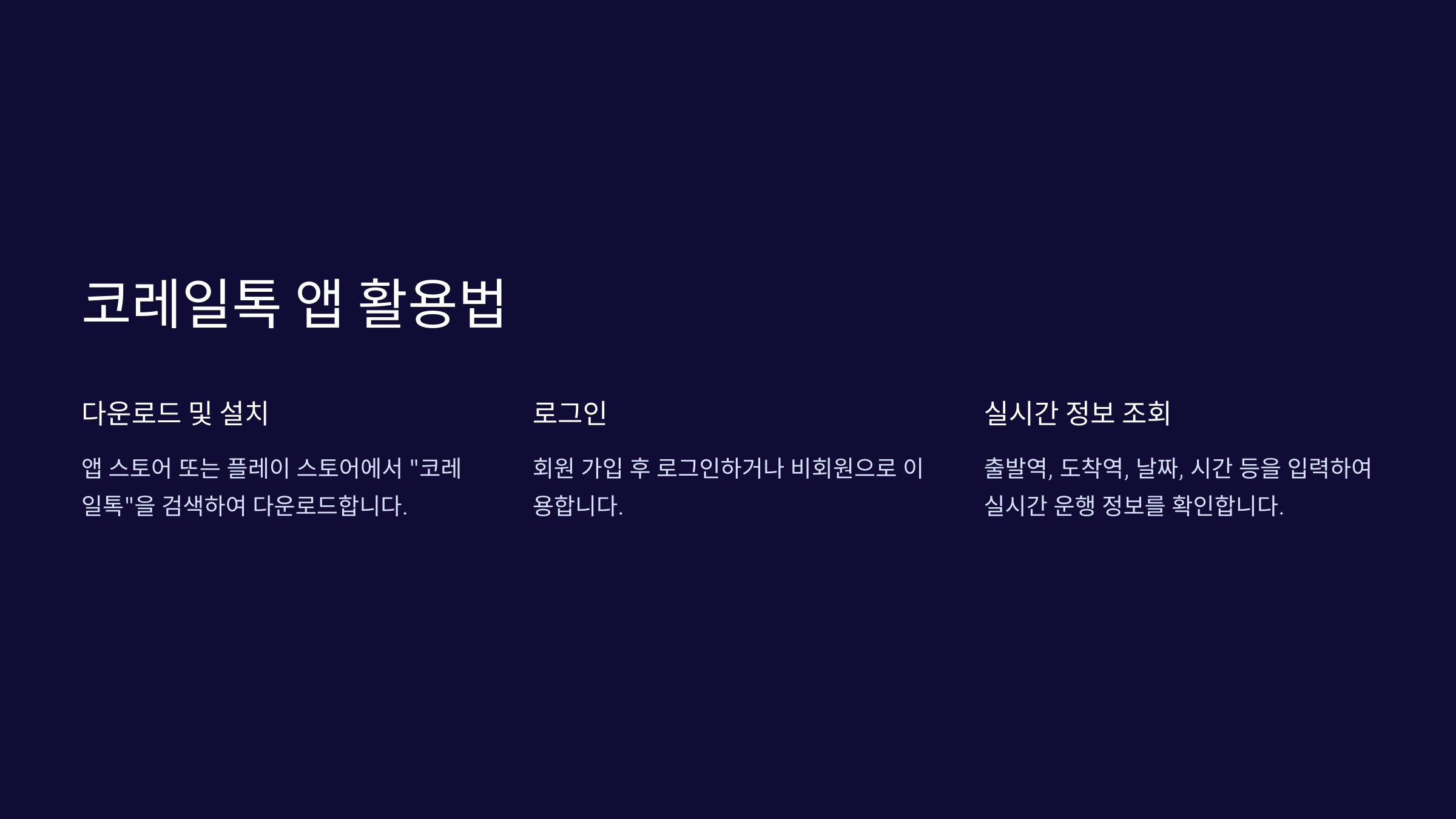코레일톡 앱은 KTX 이용자들에게 필수적인 도구예요. 앱에서 실시간 교통 정보를 확인할 뿐만 아니라, 간편하게 열차 예약과 결제를 진행할 수 있답니다.