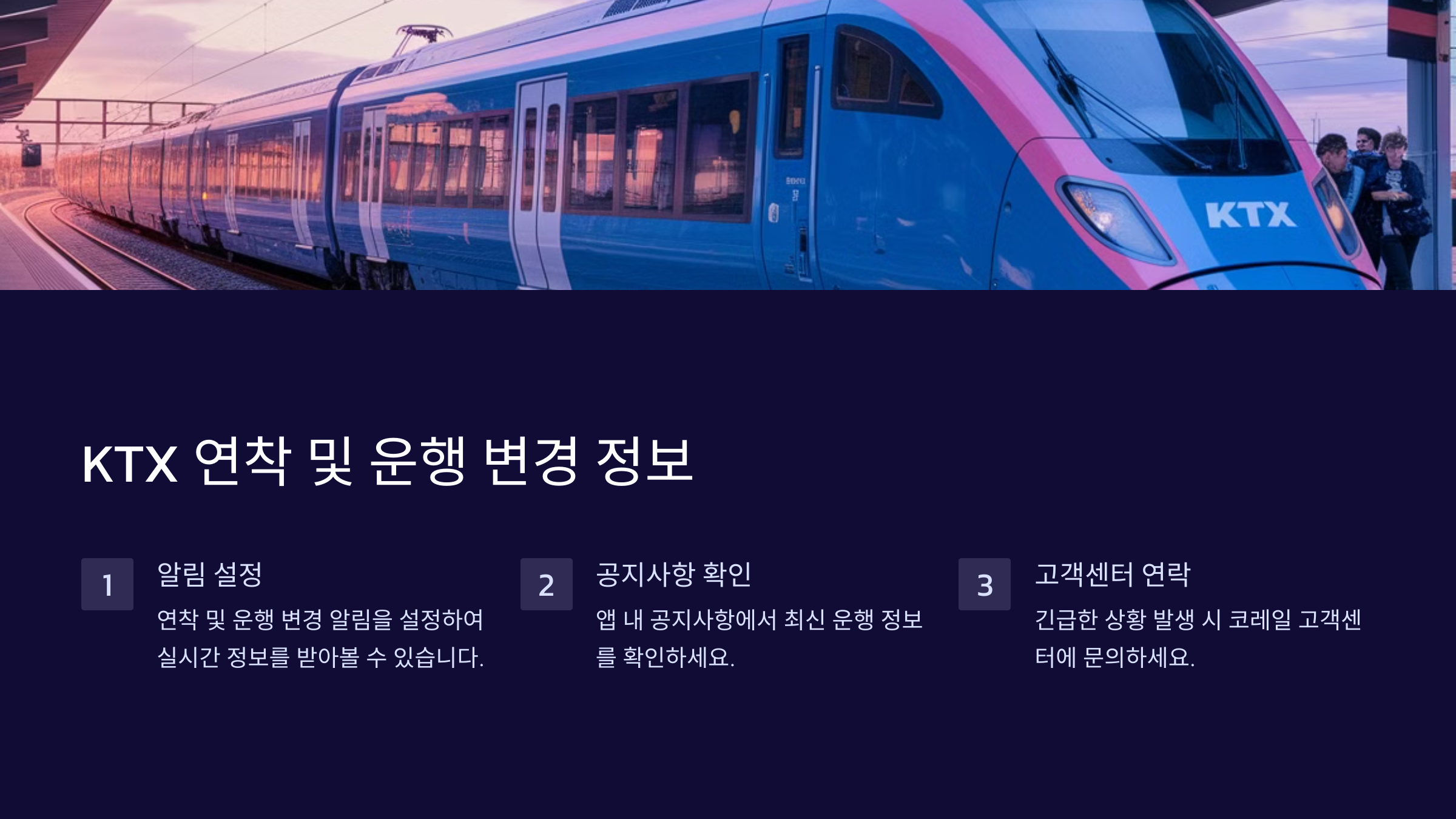 KTX 열차가 연착되거나 운행이 변경될 경우, 코레일 공식 채널에서 즉시 정보를 확인할 수 있어요. 앱과 홈페이지에서는 실시간으로 업데이트되는 공지사항을 통해 변경된 내용을 안내하고 있어요.