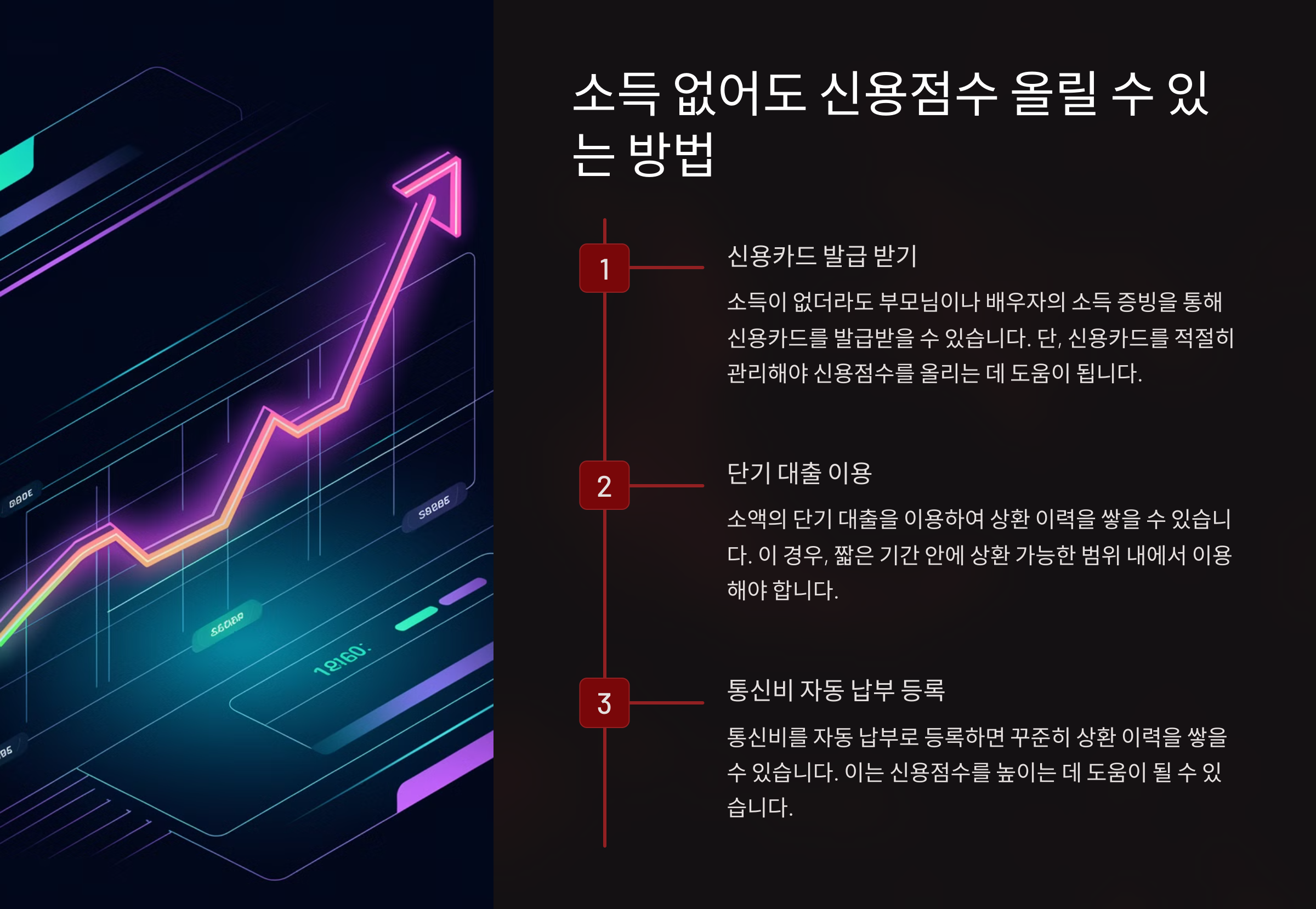 소득이 없더라도 신용점수를 올릴 방법은 많아요! 생활 속에서 신용거래를 잘 활용하고, 금융기관에서 인정하는 신용관리 방법을 실천하면 점수를 높일 수 있답니다. 🚀