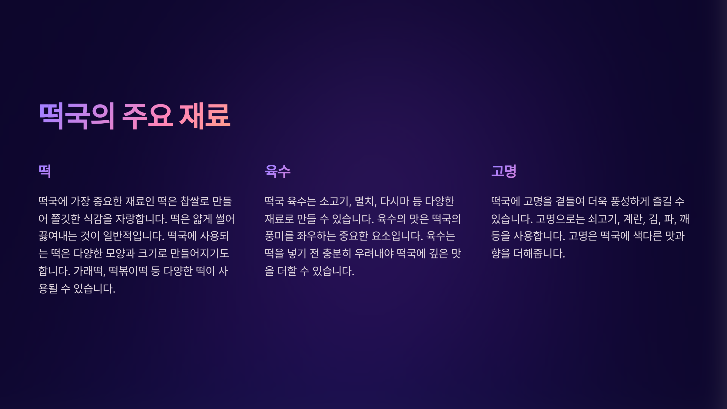1. 떡국떡: 얇게 썬 가래떡으로, 찰진 식감이 좋은 것이 좋아요. 냉동된 떡은 사용 전에 찬물에 헹궈 떡이 부서지지 않도록 해야 해요.