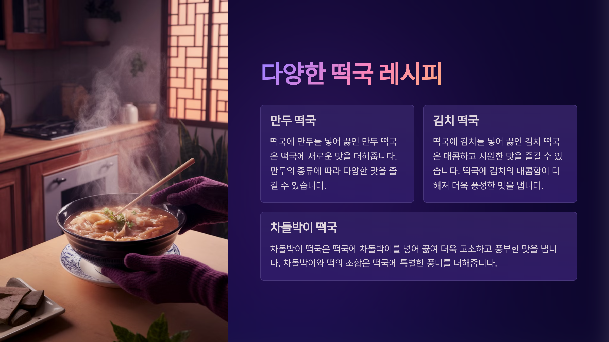 떡국은 기본 레시피 외에도 다양한 변형으로 즐길 수 있어요. 지역별로 특색 있는 떡국이 많답니다.