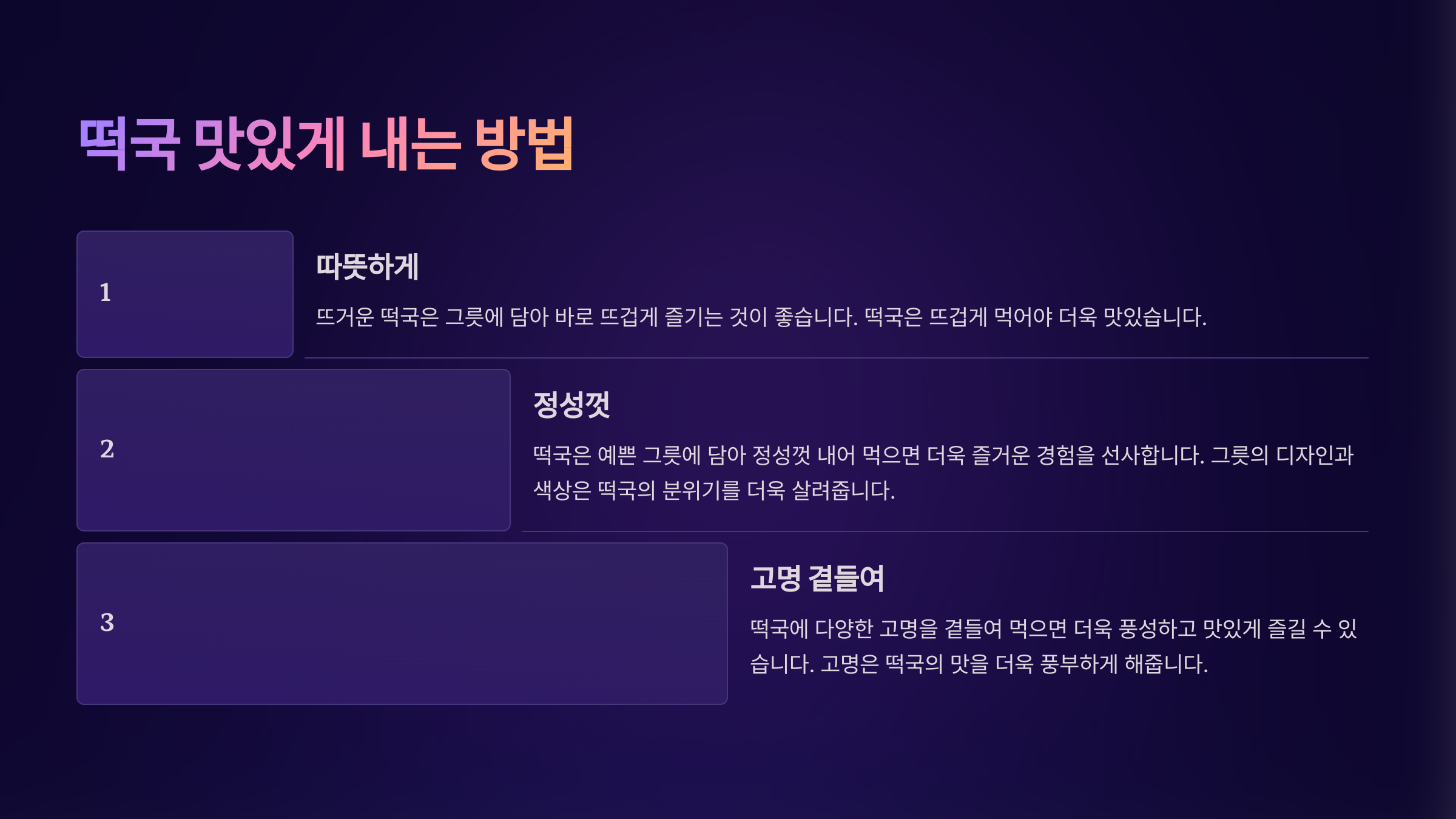 4. 마무리: 떡이 완벽히 익으면 불을 끄고 그릇에 담아주세요. 마지막으로 준비해 둔 고명(달걀지단, 김가루, 소고기 볶음)을 예쁘게 올리면 완성입니다!
