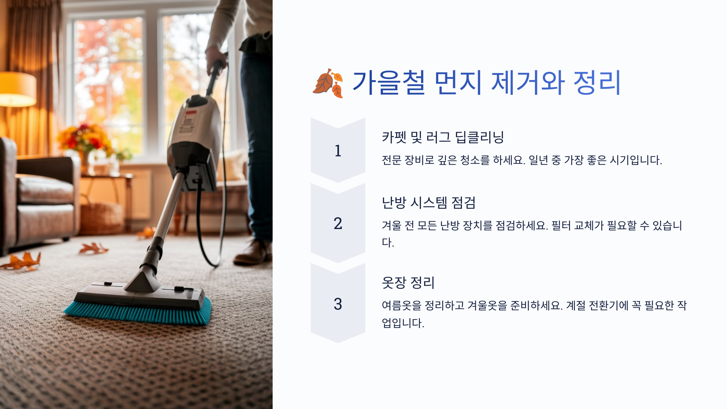 가을이 되면 기온이 선선해지고 공기가 건조해지면서 집 안에 먼지가 쌓이기 쉬워요. 환절기 청소를 통해 미세먼지를 줄이고 정리를 시작할 좋은 시기예요. 🍁
