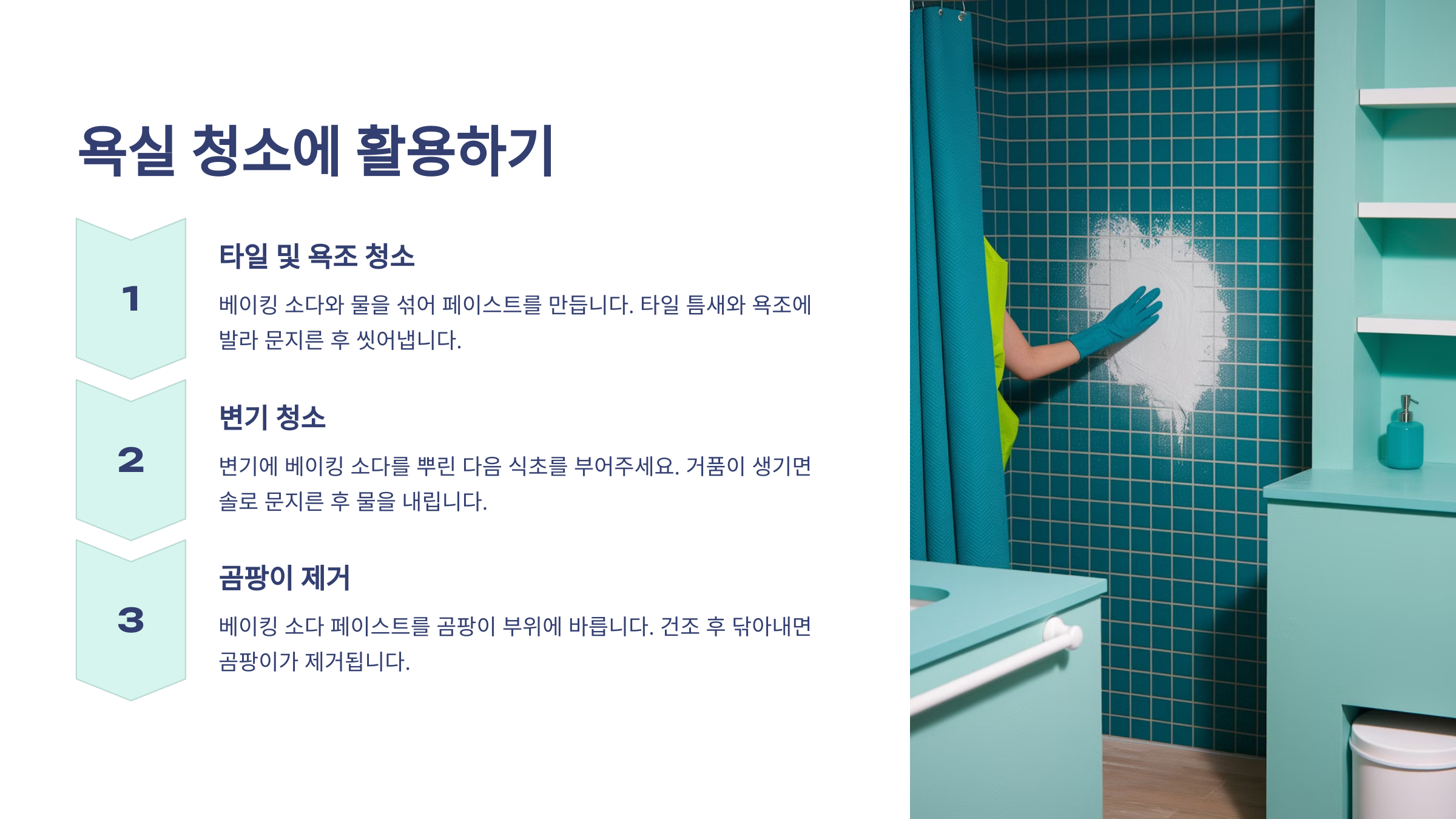 욕실은 습기가 많아 곰팡이와 물때가 쉽게 생기는 곳이에요. 베이킹 소다는 살균 효과와 함께 찌든 때를 효과적으로 제거하는데 좋아요!
