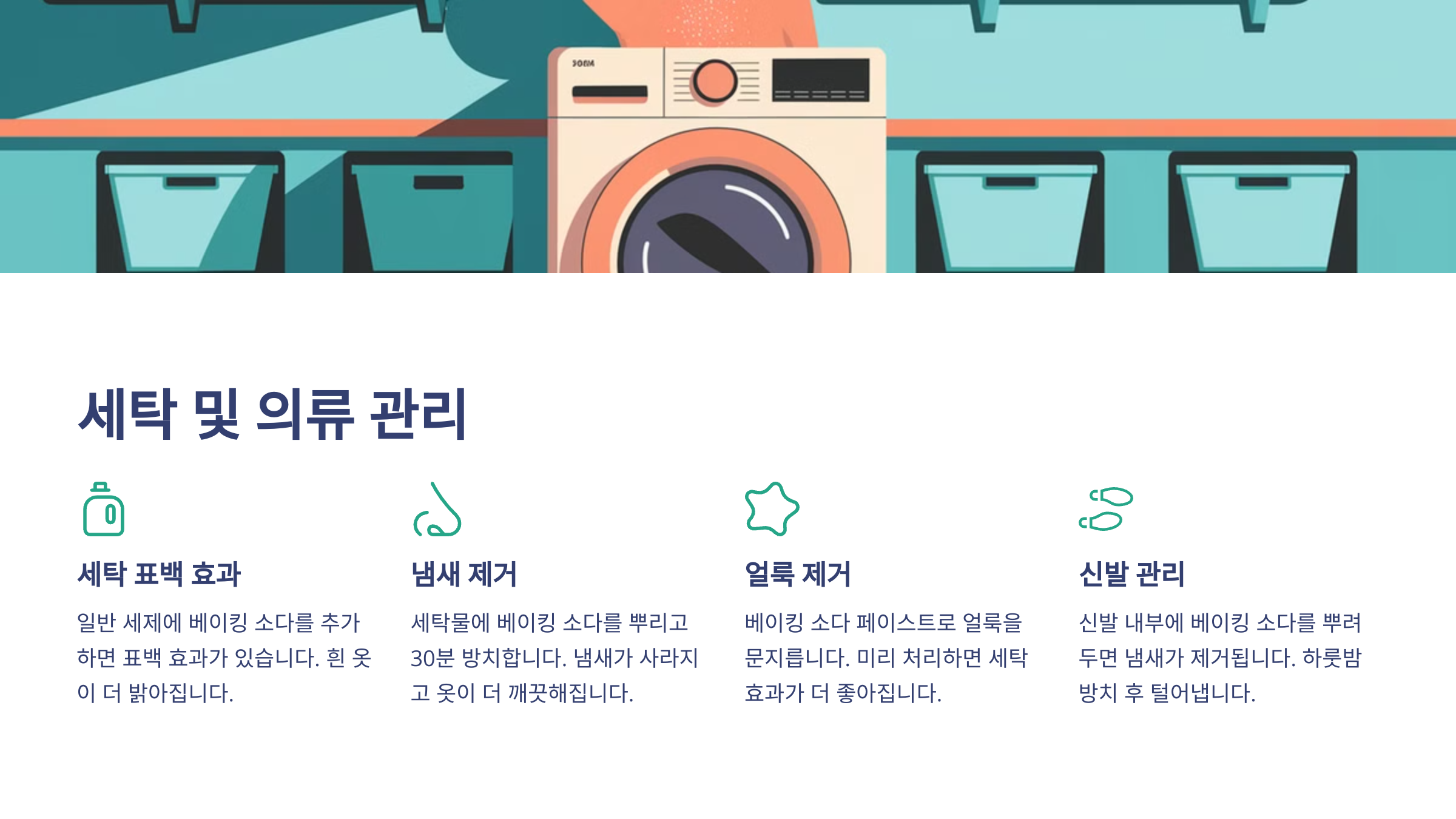 베이킹 소다는 세탁 시에도 유용해요. 옷의 냄새를 제거하고, 얼룩을 지우는 데 효과적이거든요!
